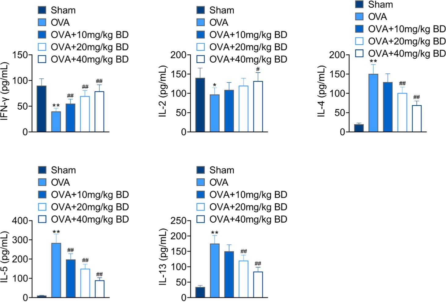 Figure 3 Effect of BD on the production of Th1/Th2-associated cytokines in OVA-exposed mice. The pulmonary concentrations of Th1/Th2-associated cytokines in all groups of mice were measured by ELISA, including IFN-γ, IL-2, IL-4, IL-5, and IL-13. *p < 0.05, **p < 0.01 compared with the Sham group; #p < 0.05, ##p < 0.01 compared with the OVA group.