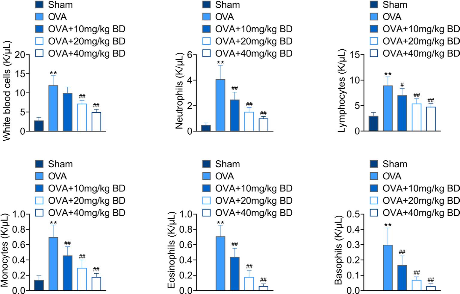 Figure 4 Effect of BD on the number of inflammatory cells in OVA-challenged mice. The serum samples were collected from all mice after the AHR assessment. The numbers of inflammatory cells, including white blood cells, neutrophils, lymphocytes, monocytes, eosinophils, and basophils in the blood were counted by a hemocytometer. **p < 0.01 compared with the Sham group; #p < 0.05, ##p < 0.01 compared with the OVA group.