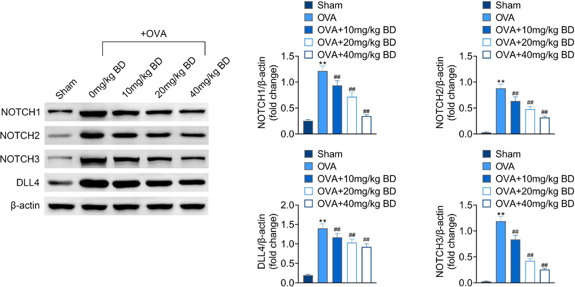 Figure 5 Effect of BD on OVA-induced activation of the NOTCH pathway. The expressions of NOTCH1, NOTCH2, NOTCH3, and DLL4 in mouse lung tissues were examined by Western blot. Beta-actin was used as an internal control. **p < 0.01 compared with the Sham group; ##p < 0.01 compared with the OVA group.