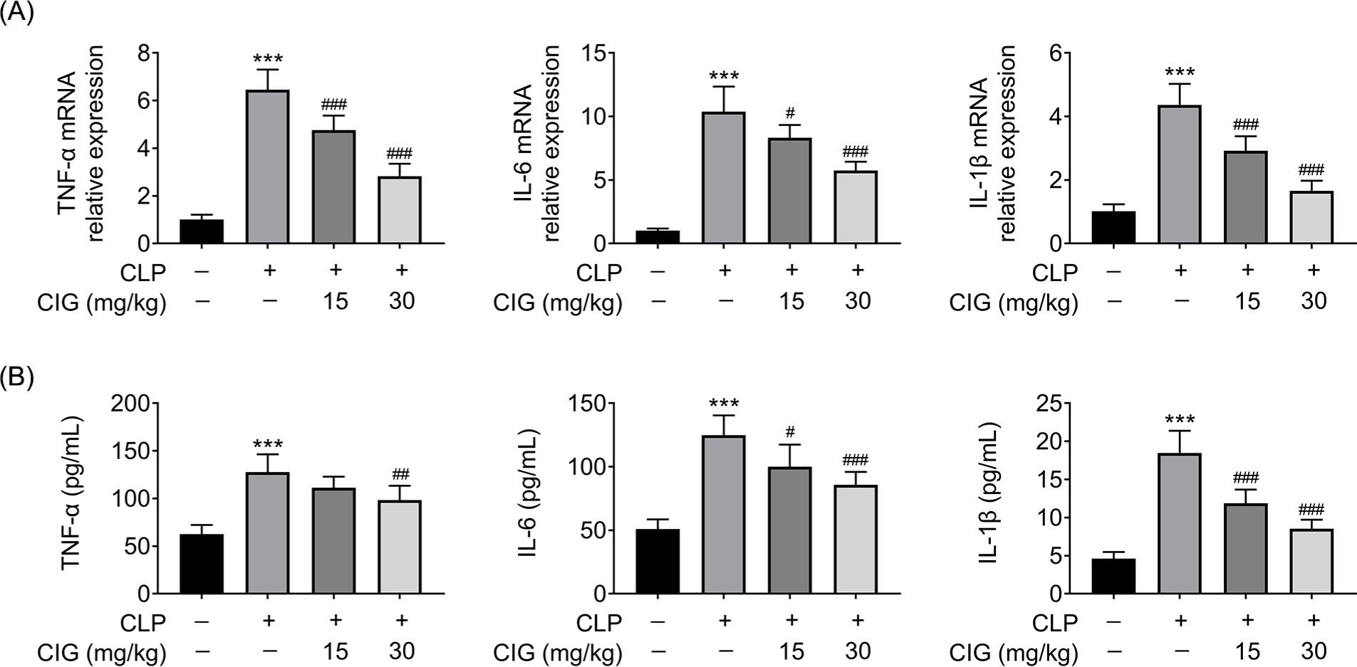 Figure 2 CIG repressed the serum level of inflammatory cytokines in mice with sepsis-induced ALI. ALI rat model was established by the induction of cecal ligation and puncture (CLP), and then intragastrically administered 15 mg/kg and 30 mg/kg of CIG, respectively. The blood was collected and serum was harvested via centrifugation. (A) The relative mRNA expressions of TNF-α, IL-6, and IL-1β in serum were examined by qRT-PCR assay. The data were determined after being normalized to GAPDH. (B) The serum levels of TNF-α, IL-6, and IL-1β were measured by ELISA. ***P < 0.001 compared to group without treatment of CLP and CIG, #P < 0.05, ##P < 0.01, and ###P < 0.001 compared to the group with CLP treatment.