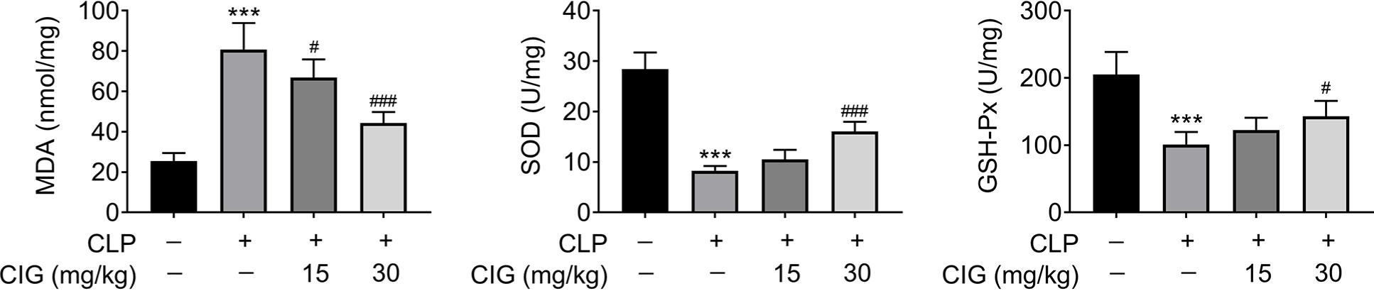 Figure 3 CIG treatment inhibited the oxidative stress of lung tissues in CLP-treated mice. ALI rat model was established by the induction of cecal ligation and puncture (CLP), and then intragastrically administered 15 mg/kg and 30 mg/kg of CIG, respectively. The lung tissues were collected, and the concentration of MDA, SOD, and GSH-Px were examined by commercial kits. ***P < 0.001 compared to the group without treatment of CLP and CIG, #P < 0.05, ##P < 0.01, and ###P < 0.001 compared to the group with CLP treatment.