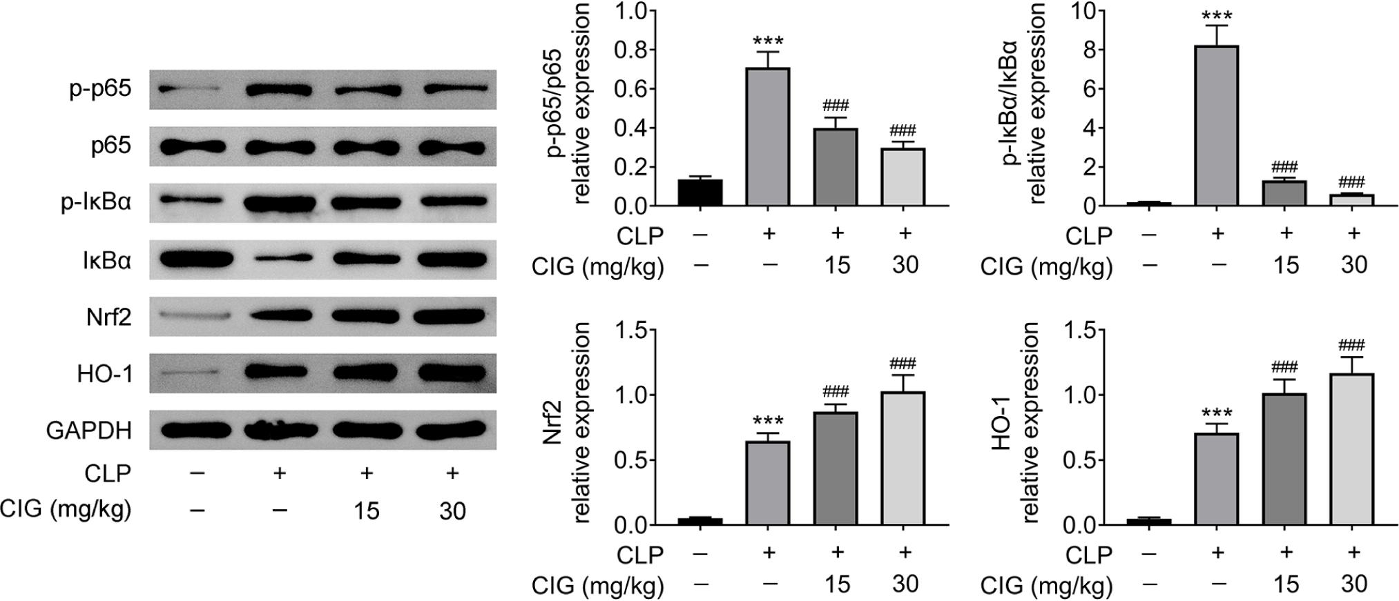Figure 4 CIG treatment attenuated NF-κB but prompted Nrf2/HO-1 signaling pathway in mice with sepsis-induced ALI. ALI rat model was established by the induction of cecal ligation and puncture (CLP), and then intragastrically administered 15 mg/kg and 30 mg/kg of CIG, respectively. The lung tissues were collected, and the relative protein levels of p-p65, p65, p-IκBα, IκBα, Nrf2, and HO-1 were determined by Western blot analysis. The data were expressed after being normalized to GAPDH. ***P < 0.001 compared to group without treatment of CLP and CIG, and ###P < 0.001 compared to the group with CLP treatment.
