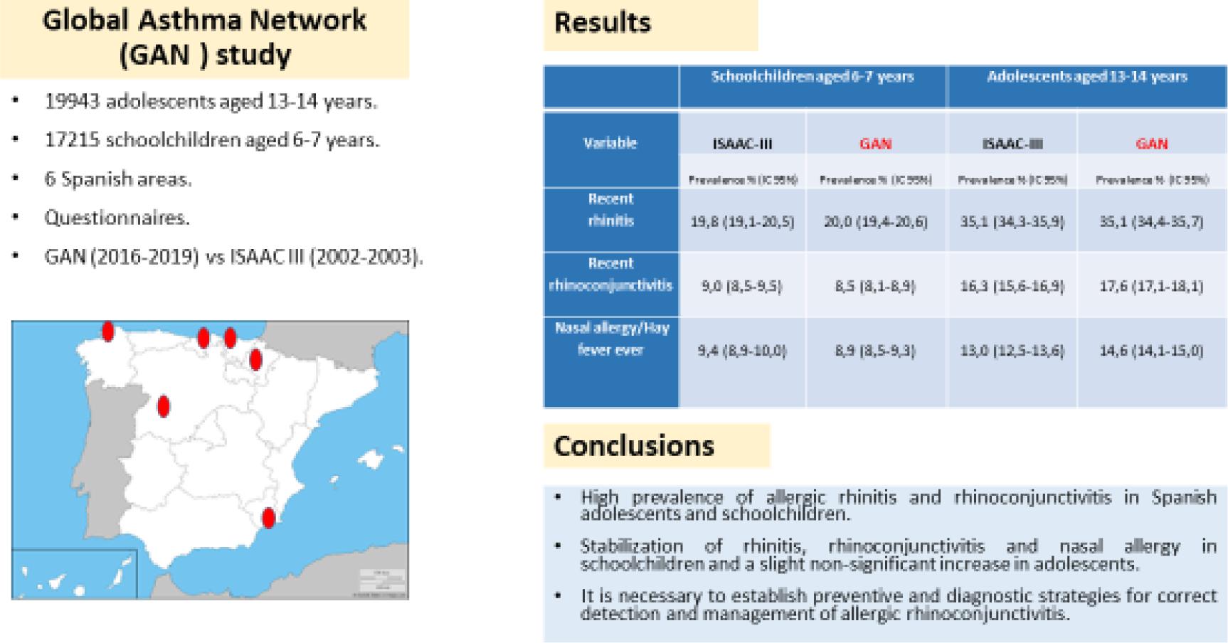 The GAN study in Spain consists of six centres: Murcia, Bilbao, Cantabria, La Coruña, Pamplona and Salamanca. The aim of the present study is to describe the prevalence of rhinitis and allergic rhinoconjunctivitis symptoms in those Spanish centres and compare the prevalence of those centres that took part in phase III of ISAAC (2002–2003) with those of the GAN study (2016–2019).