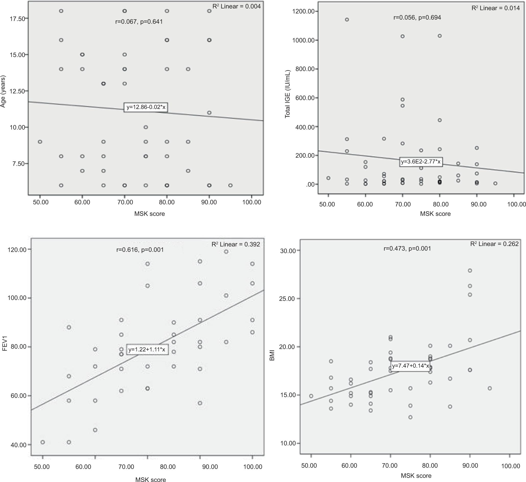 The MSK scores of patients were correlated moderately with the FEV1 predicted value and weakly with BMI values (r = 0.616 and P < 0.001; and r = 0.473 and P < 0.001, respectively). However, patients’ MSK scores were not correlated with age and total IgE levels (P > 0.05; Figure 1). The FEV1 predicted values were moderately correlated with BMI values (r = 0.528 and P < 0.001).