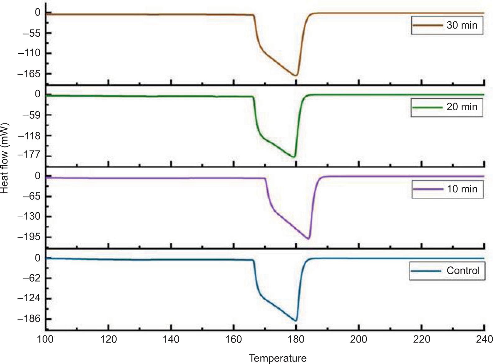 In this study, the sesame milk samples were subjected to heat from 0ºC to 300ºC. Figure 3 presents the thermograms of control and plasma-treated sesame milk samples. Almost all thermograms revealed a single deep endothermic peak at an approximate denaturation or peak temperature (165–170ºC approx.). The endothermic peaks obtained in the present study, the onset temperature, the peak or denaturation temperature, and the enthalpy of the control and the plasma-treated samples were presented in Table 1. The onset temperature of raw sesame milk was 165.95ºC, which changed to 169.59ºC, 165.83ºC, and 166.02ºC plasma-bubbled samples at 10-, 20-, and 30 min, respectively. The peak denaturation temperature also varied with respect to plasma treatment. However, the change does not follow any trend; the peak temperature in raw milk (169.65ºC) increased to 173.07ºC at 10 min whereas at 20 min (169.95ºC), it remained similar to that of the control. At 30-min plasma-bubbled sample, the peak value was observed at 170.79ºC. In this study, the enthalpy value decreased with increase in the processing condition. The enthalpy of raw sesame milk was 1360.03 J/g, which decreased in plasma-processed sesame milk samples. The enthalpy at 10-, 20- and 30-min plasma-bubbled samples decreased to 1330.13 J/g, 1251.41 J/g, and 1240.28 J/g, respectively.