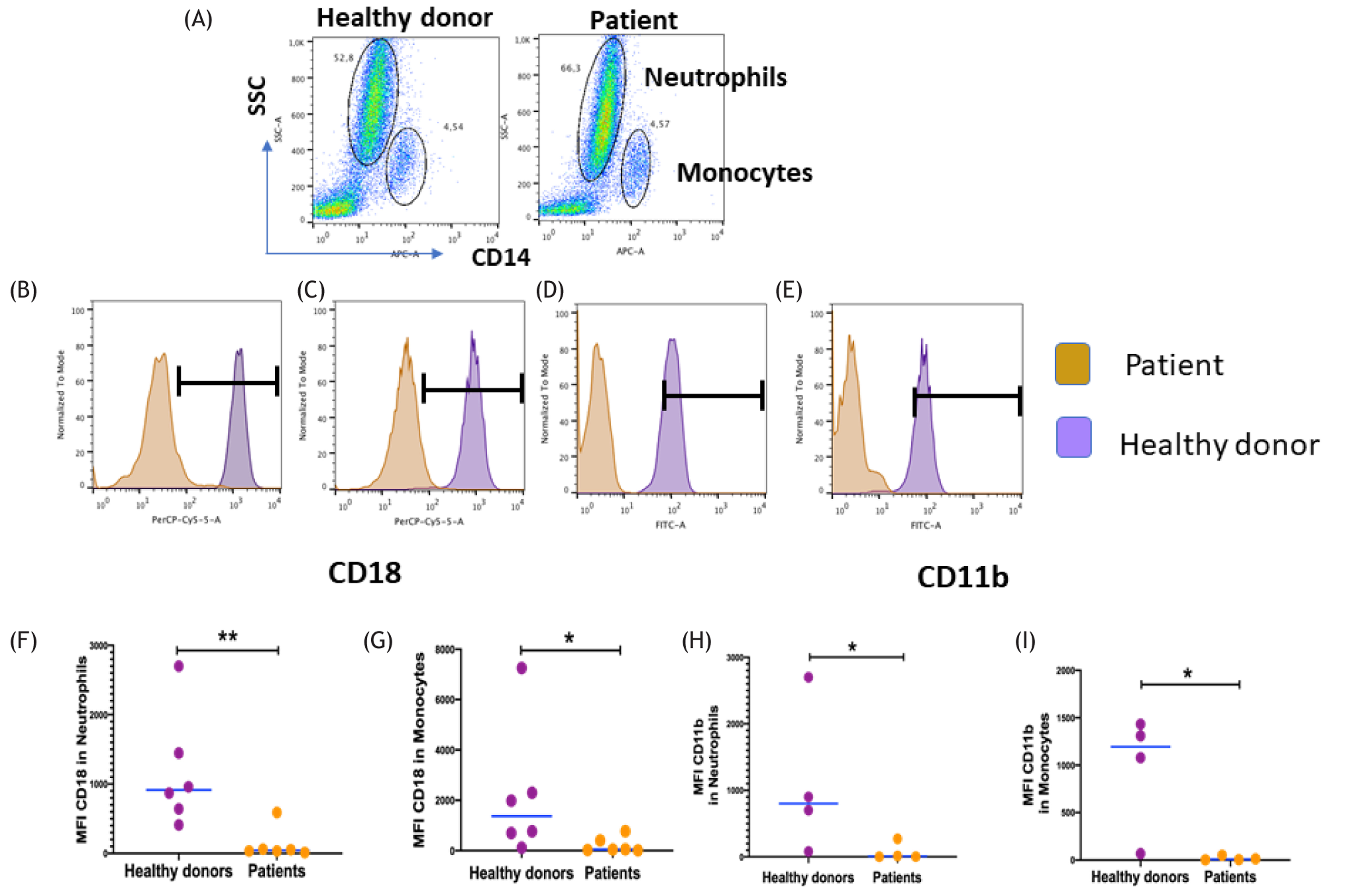 Figure 1 Analysis expression of CD18 and CD11b in neutrophils and monocytes by flow cytometry. (A) Neutrophils and monocytes were gated in CD14+ and side-scatter regions. Expression of CD18 in (B) neutrophils and (C) monocytes in patients (yellow) and healthy donors (violet). Expression of CD11b in (D) neutrophils and (E) monocytes in patients (yellow) and healthy donors (violet). The black bar shows a positive expression of CD18 or CD11b. Comparison of expression of CD18 MFI in (F) neutrophils and (G) monocytes; and that of CD11b MFI in (H) neutrophils and (I) monocytes in patients (n = 6) and healthy donors (n = 6). Statistical differences between patients and healthy donors were compared using the Mann–Whitney U test. *Significant, P = 0.05; **very significant, P = 0.01; and ***highly significant, P = 0.001. MFI = mean fluorescent intensity.