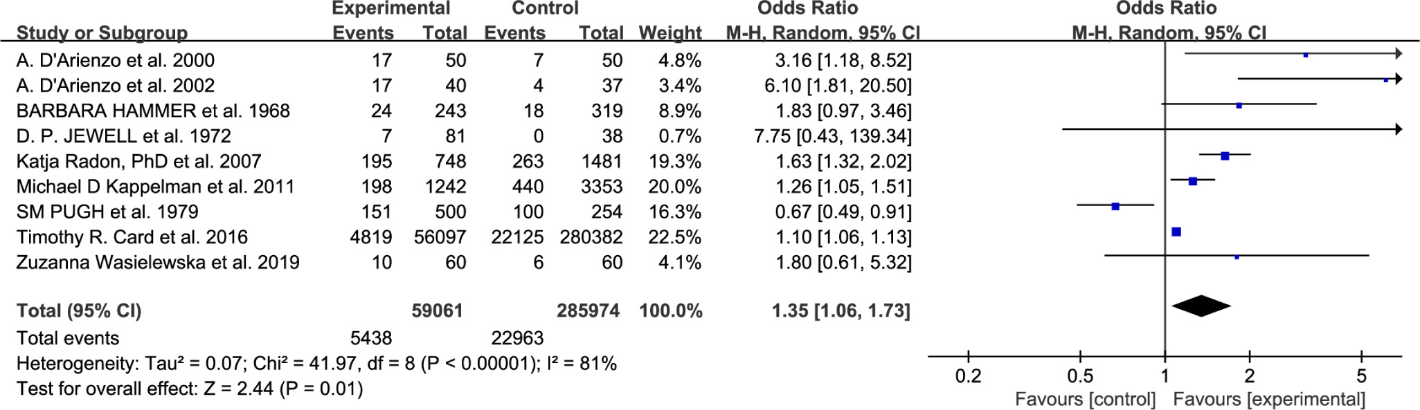 Results: There were 10 case-control studies and 1 cohort study included in the meta-analysis. The experimental group consisted of 65,687 IBD patients, of whom 5838 had AR. A total of 345,176 participants without IBD were included in the control group, of whom 24,625 developed AR. The outcomes demonstrated that IBD patients had a higher risk of developing AR (odds ratio [OR] = 1.48, 95% confidence interval [CI] [1.12, 1.95], Z = 2.78, P = 0.005) than those without IBD.