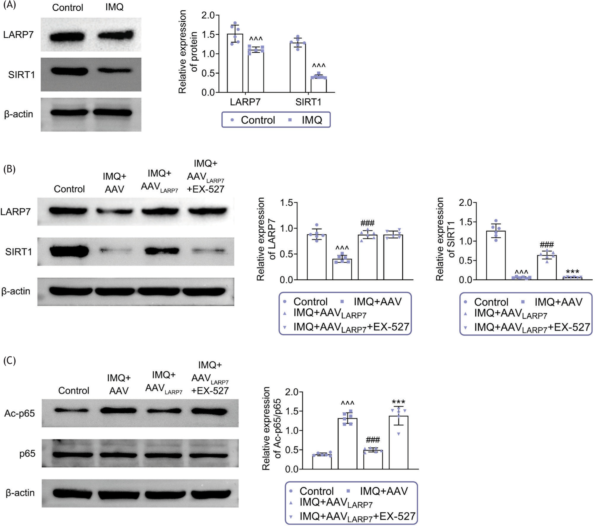 Figure 1 LARP7 upregulated SIRT1 deacetylase activity. (A) Immunoblot assays showed the expression of LARP7 and SIRT1 in lesion tissues of mice in the indicated group. (B) Immunoblot assays showed the expression of LARP7 and SIRT1 in lesion tissues of mice in the control and IMQ groups upon having the indicated treatment. (C) Immunoblot assays showed the expression of p65 and Ac-p65 in lesion tissues of mice in the control and IMQ groups upon having the indicated treatment. Data are presented as mean ± SD. ^^^P < 0.001, IMQ vs. control, ###P < 0.001, IMQ+AAV-LARP7 vs. IMQ+AAV, ***P < 0.001, IMQ+AAV-LARP7+EX-527 vs. IMQ+AAV-LARP7
