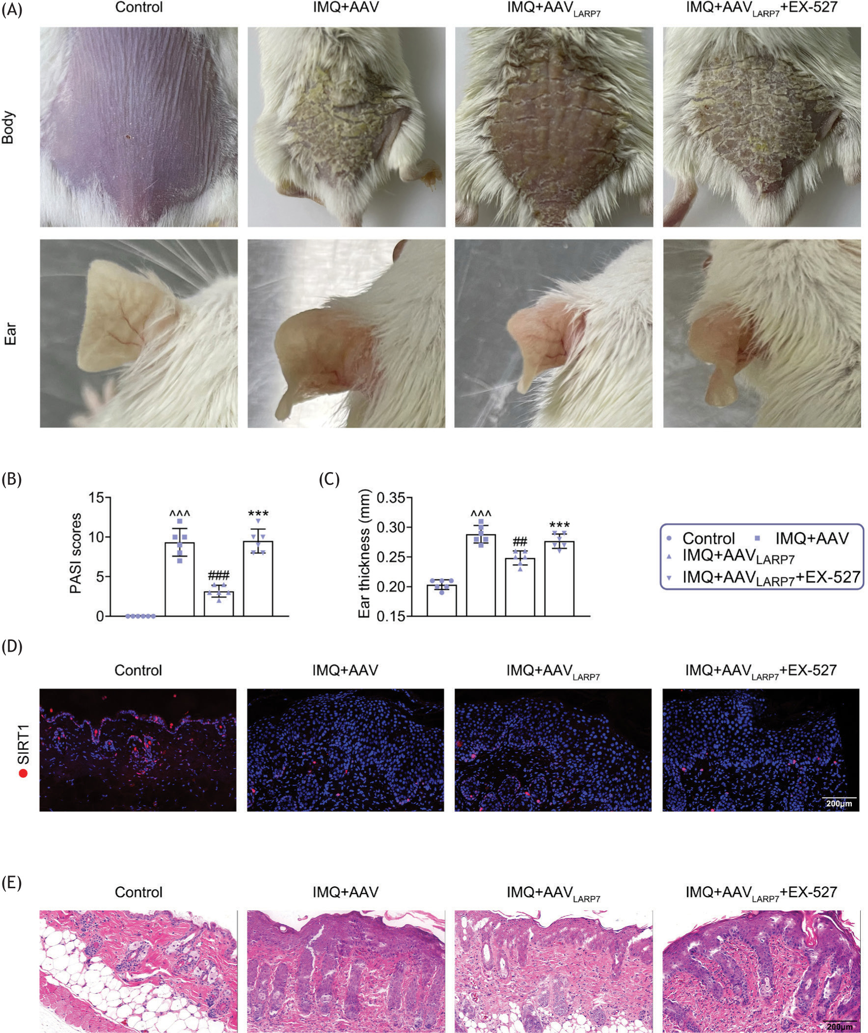Figure 2 LARP7 alleviated psoriasis symptoms in mice by upregulating SIRT1 deacetylase activity. (A) Lesions (back + left ear) in mice of the control and IMQ groups upon having the indicated treatment. (B) PASI scoring showed the degree of lesions in mice of the control and IMQ groups upon having the indicated treatment. (C) Ear thickness showed the degree of lesions in mice from the control and IMQ groups upon having the indicated treatment. (D) Immunostaining showed the expression of SIRT1 in mice of the control and IMQ groups upon having the indicated treatment. (E) H&E staining showed lesions in mice of the control and IMQ groups upon having the indicated treatment. Data are presented as mean ± SD. ^^^P < 0.001, IMQ vs. control, ##P < 0.01, ###P < 0.001, IMQ+AAV-LARP7 vs. IMQ+AAV, ***P < 0.001, IMQ+AAV-LARP7+EX-527 vs. IMQ+AAV-LARP7