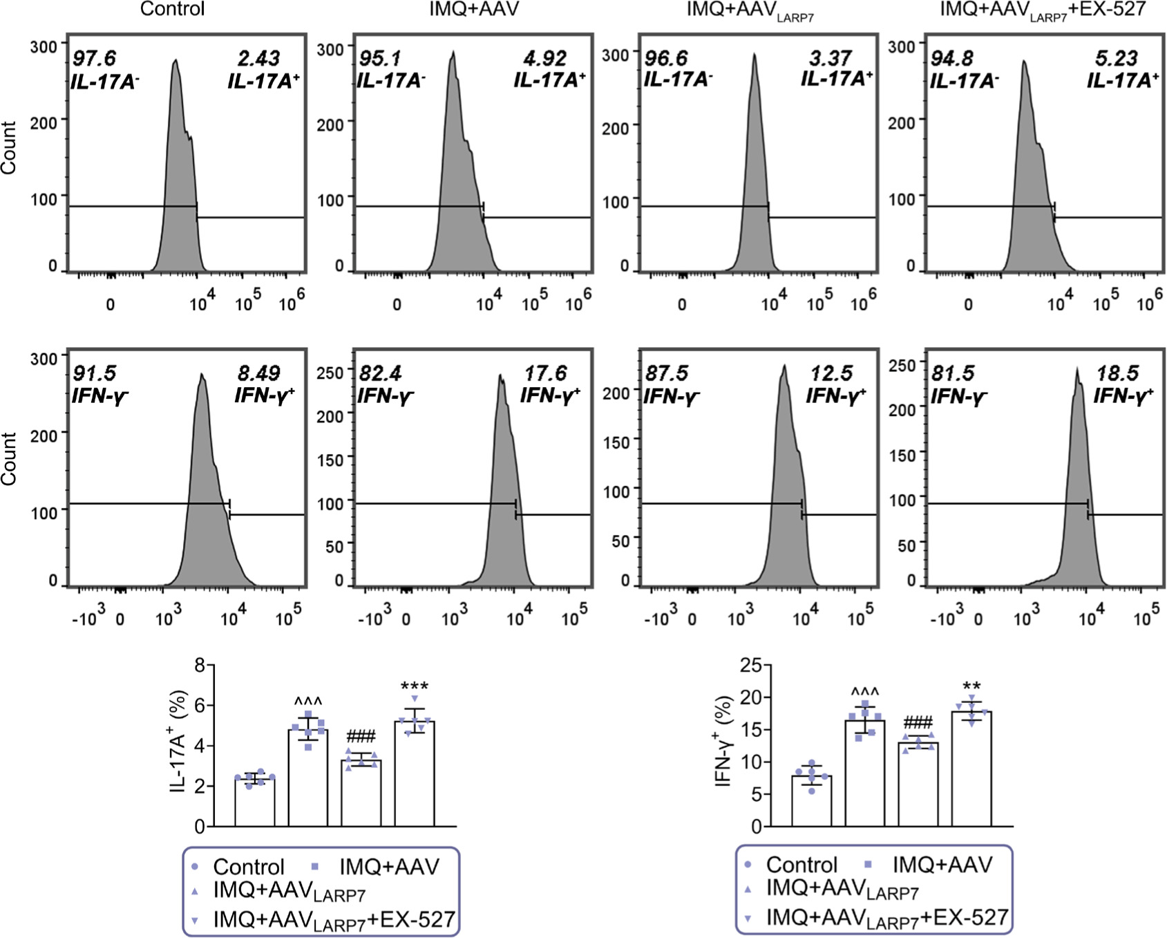 Figure 3 LARP7 regulated Th1/Th17 cell differentiation in psoriatic mice. FCM assays showed the IL-17+ (up) and IFN-γ (down) CD4+T cells from lession tissues in mice of the control and IMQ groups upon having the indicated treatment. The percentage was quantified. Data are presented as mean ± SD. ^^^P < 0.001, IMQ vs. control, ###P < 0.001, IMQ+AAV-LARP7 vs. IMQ+AAV, **P < 0.01, IMQ+AAV-LARP7+EX-527 vs. IMQ+AAV-LARP7