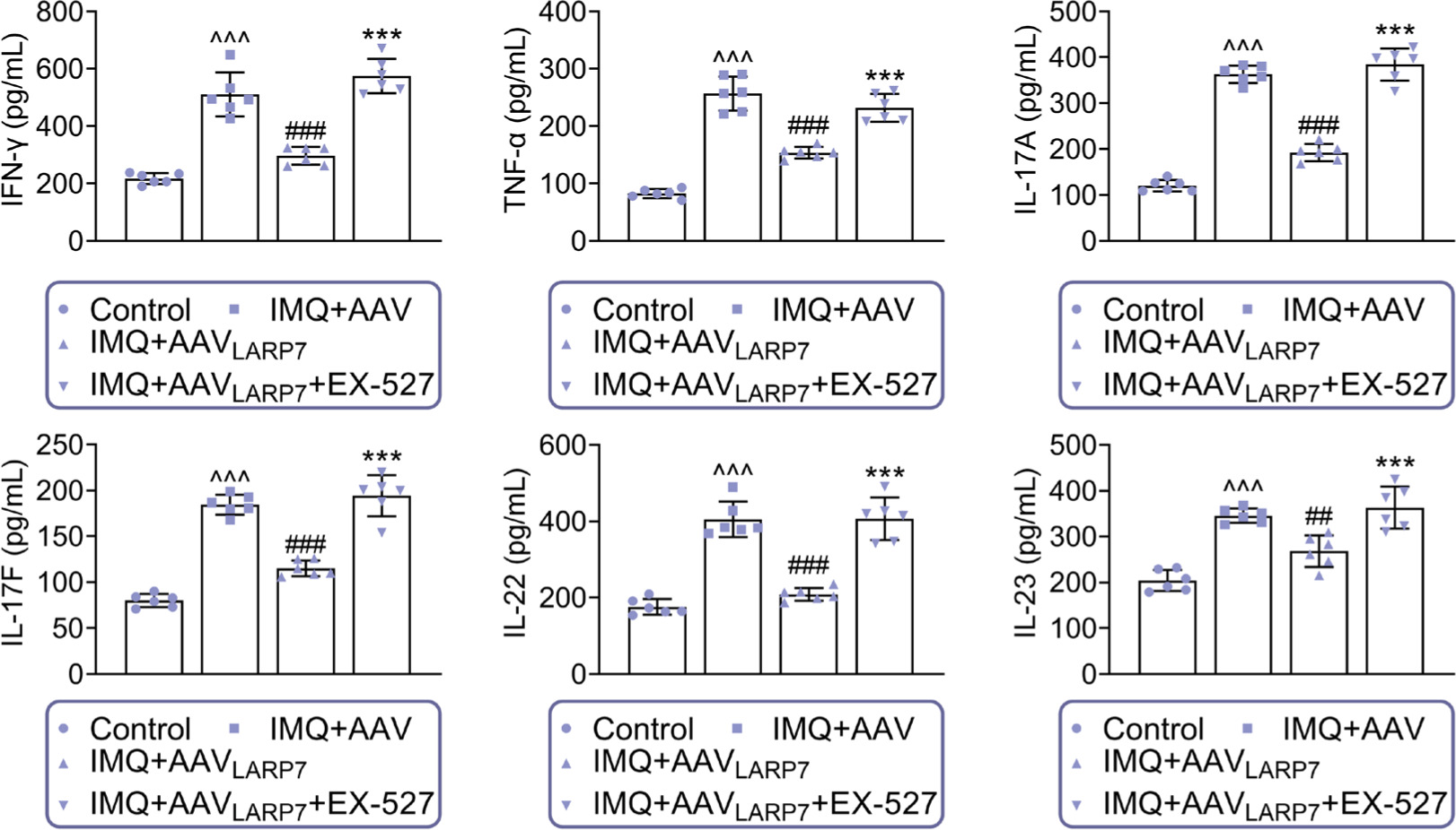 Figure 4 LARP7 inhibited the secretion of Th1/Th17 cytokine. ELISA assays showed the secretion of IFN-γ, TNF-α, IL-17A, IL-17F, IL-22, and IL-23 in lession tissues in mice of the control and IMQ groups upon having the indicated treatment. Data are presented as mean ± SD. ^^^P < 0.001, IMQ vs. control, ###P < 0.001, IMQ+AAV-LARP7 vs. IMQ+AAV, ***P < 0.001, IMQ+AAV-LARP7+EX-527 vs. IMQ+AAV-LARP7.
