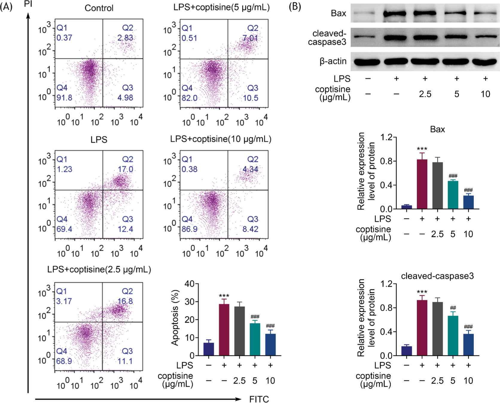 Figure 3 Effect of coptisine on cell apoptosis induced by LPS. (A) Flow cytometry analysis of MLE-12 cell apoptosis by Annexin V-FITC/PI staining. Lower-left quadrant (Annexin V- and PI-) represents live healthy cells; lower-right quadrant (Annexin V+ and PI-) represents early apoptotic cells; upper-right quadrant (Annexin V+ and PI+) represents late apoptotic or dead cells; and upper-left quadrant (Annexin V- and PI+) represents mechanically damaged cells or necrotic cells. (B) The expression of Bax and cleaved Caspase-3 was detected by Western blot analysis. β-actin was selected as a reference protein. Semi-quantitative analysis of Bax and cleaved Caspase-3 expression was calculated through image analysis software