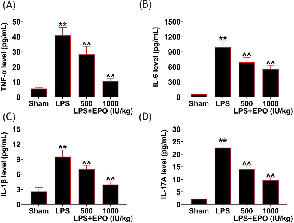Figure 2 EPO reduced the release of inflammatory factors induced by LPS. The levels of (a) TNF-α, (b) IL-6, (c) IL-1β, and (d) IL-17A in control, LPS, EPO (500 IU/kg)-treated LPS, and EPO (1000 IU/kg)-treated LPS mice were observed through ELISA. ##P < 0.01 vs. Sham; ^^P < 0.01 vs. LPS