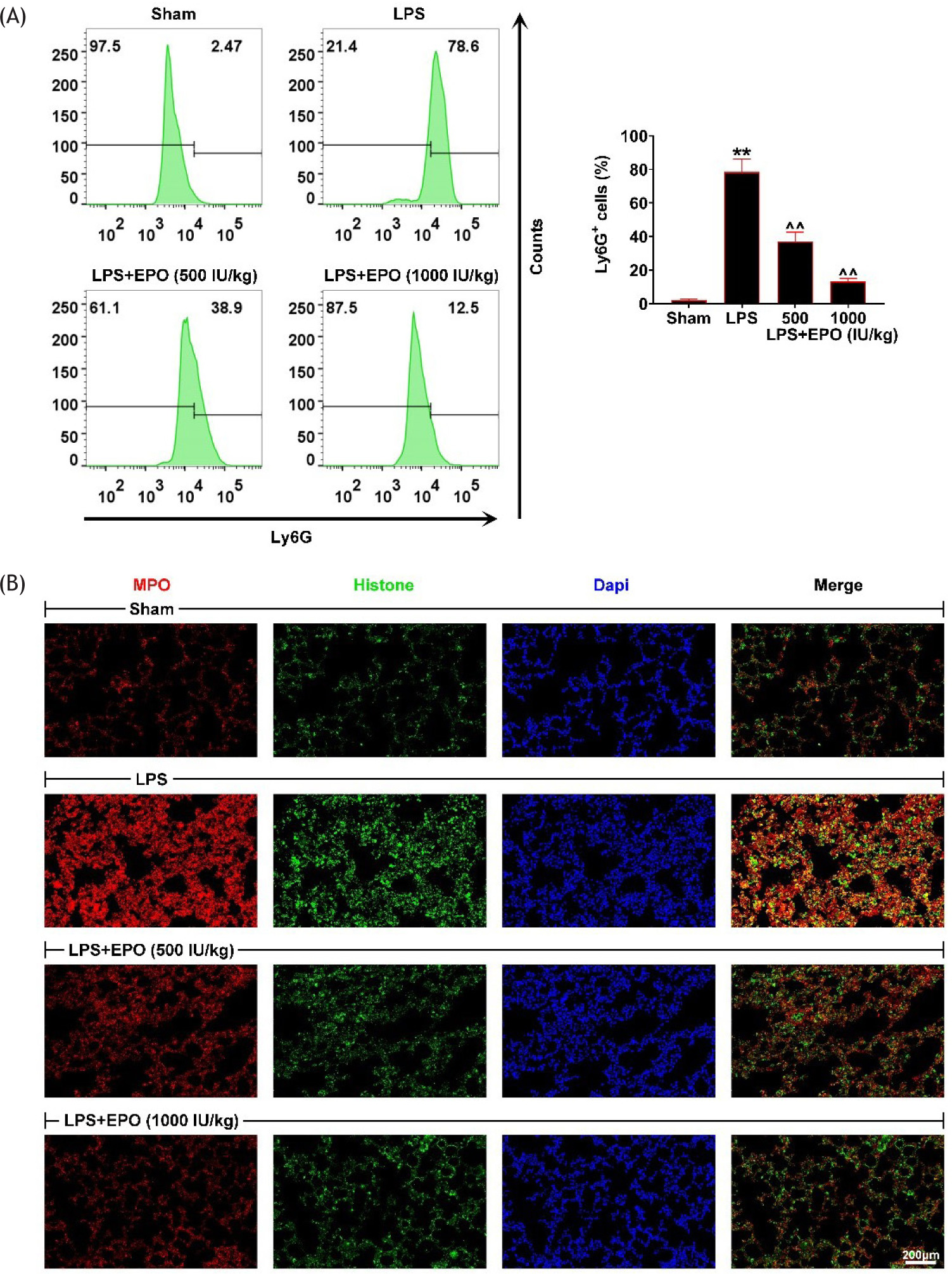Figure 3 EPO inhibited the formation of NETs. (a) The number of neutrophils in control, LPS, EPO (500 IU/kg)-treated LPS, and EPO (1000 IU/kg)-treated LPS mice was measured by flow cytometry. Ly6G-positive cells were measured to reflect the formation of NETs. (b) Immunostaining assays showed the expression of MPO (red) and histone (green) in lung tissues from control, LPS, EPO (500 IU/kg)-treated LPS, and EPO (1000 IU/kg)-treated LPS mice. Scale bar: 200 um. **P < 0.01 vs. Sham; ^^P < 0.01 vs. LPS