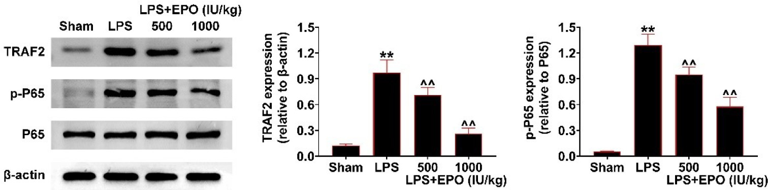 Figure 4 EPO inhibited TRAF2/NF-κB activity in mouse models. Immunoblot showed the expression of TRAF2, p65, and the phosphorylation levels of p65 in lung tissues from control, LPS, EPO (500 IU/kg)-treated LPS, and EPO (1000 IU/kg)-treated LPS mice. The relative expression was quantified. **P < 0.01 vs. Sham; ^^P < 0.01 vs. LPS.