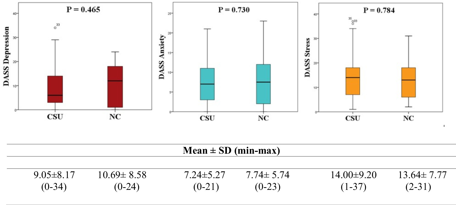 Figure 1 Comparison of depression, anxiety and stress levels between CSU patients and normal controls. p values were obtained by the independent sample t-test. DASS, Depression Anxiety Stress Scale; SD, standard deviation; CSU, chronic spontaneous urticaria; NC, normal healthy controls.