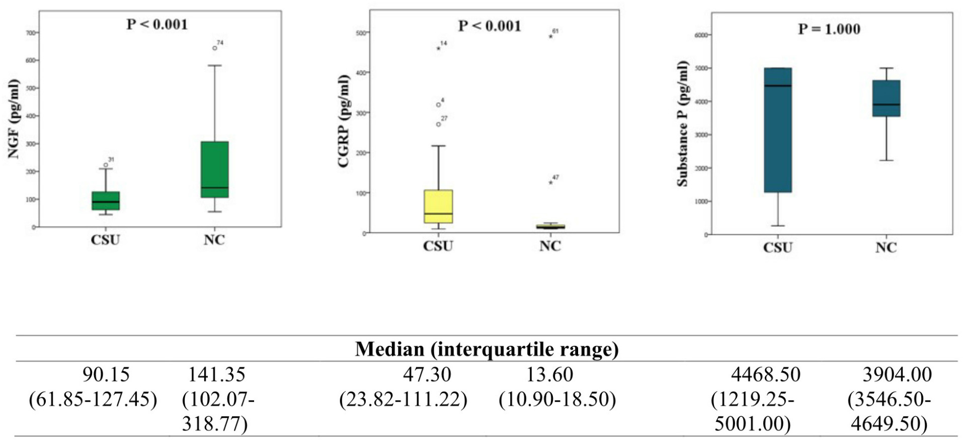 Figure 2 Comparison of NGF, CGRP and SP levels between CSU patients and normal controls. p values were obtained by the Mann–Whitney U-test. NGF, nerve growth factor; CGRP, calcitonin gene-related peptide; substance P, SP; IQR, interquartile range; CSU, chronic spontaneous urticaria; NC, normal healthy controls.