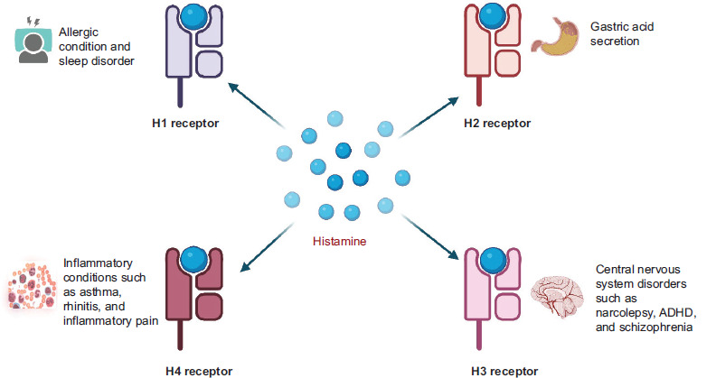Histamine exerts its effects through four different types of histamine receptors, all of which belong to the G protein-coupled receptor (GPCR) family and are characterized by unique pharmacological properties and specific amino acid sequences.25 These receptors, H1R, H2R, H3R, and H4R, mediate various physiological and pathophysiological processes, including neurotransmitter release, regulation of cell functions, organ perfusion, and modulation of inflammatory responses (Figure 2).5 In addition, histamine influences processes such as pain perception, hormone secretion, cytokine synthesis, and tissue repair.26