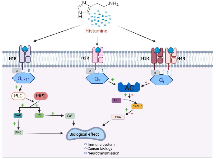 Complex intracellular signaling pathways initiated by histamine receptors exhibit considerable variability depending on the specific activated subtype (Figure 3), with H1R and H2R being particularly important. H1R is intricately linked to multiple Gq, G11, and G12 proteins, thereby activating the phospholipase C (PLC)/Ca+ mobilization pathway and promoting phosphoinositide hydrolysis upon histamine binding. This robust and multifaceted activation leads to the production of DAG and IP3, which subsequently results in the efficient release of a large amount of calcium ions from the cell and facilitates the activation of protein kinase C (PKC).24,37 In contrast, H2R is coupled synergistically with various proteins to stimulate adenylyl cyclase (AC), leading to a significant increase in cAMP levels. This elevation in cAMP ultimately serves as a powerful activator of protein kinase A (PKA), further accentuating its profound impact.38 Despite their distinct characteristics, the intricate signaling pathways of histamine receptors collectively reveal the multifaceted tissue-specific effects of histamine activation. This complexity underscores the broad influence of histamine on both physiological and pathological processes, highlighting the importance of individual receptor subtypes and their diverse associated signaling pathways in shaping the overall response.39,40