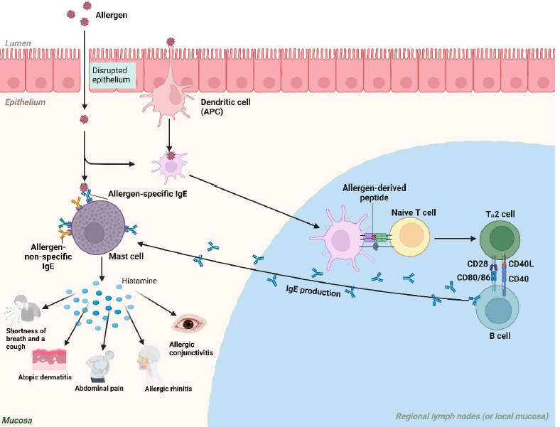 The mediatory role of histamine in immune cell regulation has steadily gained attention in recent decades. Although it has long been viewed as a principal pro-inflammatory molecule, and is indeed involved in that capacity, recent literature reveals additional paradoxical functions, including the down-regulation of T cell immunity. In this overarching role of both downregulating and perpetuating immune responses, histamine may also act as a feedback signal to exert a protective role against excessive inflammation.2,123 As a versatile molecule with multiple receptors, histamine is capable of orchestrating the function of a wide variety of immune cells, including adjusting their capacity to respond to antigens. This review explores the various roles of histamine in mediating immune cell function. The activation of H1R, H2R, and H3R histamines mediates the pro-inflammatory functions of histamine. These receptors regulate a variety of pathways within immune cells, leading to altered cytokine production, eosinophil migration, bronchial smooth muscle contraction, and increased endothelial cell permeability. However, beyond its regulatory capacity in eliciting pro-inflammatory responses, numerous studies have also characterized H4R-mediated functions of histamine, including mucus production and chemotaxis of immune cells, as well as potential immune-modulatory roles of histamine.124,125 This more obscure function of histamine is of great interest, as, under certain pathogenic conditions, it may be capable of curtailing excessive and potentially dangerous immune responses. The histamine immunological pathway is activated by allergens when they come into contact with the epithelial surface, resulting in an IgE-mediated hypersensitivity reaction. This sequence of events begins when allergens compromise the epithelial barrier and interact with antigen-presenting dendritic cells (APCs). These APCs process the allergen and subsequently present the allergen-derived peptide to naïve T cells, initiating their differentiation into T-helper 2 (TH2) cells. TH2 cells, through interactions such as CD28-CD80/86 and CD40-CD40L with B cells, facilitate the switching of B cell classes and the generation of allergen-specific IgE antibodies. Additionally, IgE antibodies adhere to Fc receptors located on the surface of mast cells, thereby sensitizing them for future interactions with the specific allergen. Upon reexposure to the allergen, the allergen-specific IgE present on mast cells undergoes crosslinking with the allergen, which triggers the degranulation of mast cells and the subsequent release of histamine as well as other inflammatory mediators. This process culminates in a range of allergic manifestations, which can include allergic conjunctivitis, allergic rhinitis, dyspnea, coughing, abdominal discomfort, and atopic dermatitis (Figure 4).126–128 Histamine’s regulatory roles in the immune system were first suggested more than 60 years ago when it was reported that some bacterial infections, and particularly anaphylactic shock, were associated with a sudden drop in circulating antibodies. This was paralleled by the observation that passive serum transfer from histamine-free rats was insufficient to confer protection. In other words, these early studies suggested a central role for histamine in the regulation of humoral immune responses.129,130