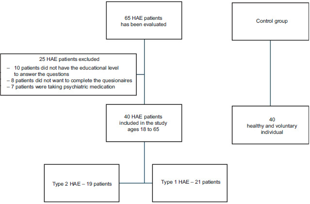 This cross-sectional study was conducted in the Adult Immunology and Allergy Clinic, Department of Internal Medicine, between 2023 and 2024. In all, 65 HAE patients followed in our clinic were screened, and 40 HAE-C1-INH-diagnosed patients who met the appropriate criteria were included in the study. Inclusion criteria in the study comprised patients aged 18–65 years, voluntary participation in the study, and complete answering of all questions in the scales. Patients with low C1-INH levels and functioning were classified as type-1 HAE, and those with normal/high C1-INH levels but low functioning were classified as type-2 HAE. In addition, 40 healthy individuals from the general population were included in the study as a control group. Individuals with a known diagnosis of HAE, chronic inflammatory diseases, psychiatric disorders, or medical conditions that could directly affect sleep quality or sexual function were excluded. Control group patients were selected to be comparable to the patient group with respect to age and sex distribution. Formal matching of socioeconomic variables, such as education level and employment status, was not performed, as the study was designed as an exploratory analysis, and the available sample size limited the feasibility of multivariable adjustment without increasing the risk of model overfitting. Potential differences in sociodemographic characteristics between groups were therefore acknowledged and considered in the interpretation of psychometric outcomes. In both groups, having a diagnosis of sleep disorder and using medical treatment or devices for this purpose were taken as exclusion criteria. After explaining the study, written informed consent was obtained from all participants, and the study was conducted with a total of 80 participants (Figure 1).