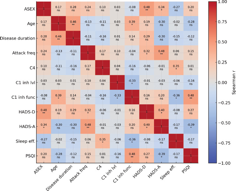 Figure 3 Color-coded correlation matrix (r and P values). Notes. Color-coded Spearman’s correlation matrix demonstrating relationships between sociodemographic variables, clinical parameters, psychometric test scores, and complement levels in the patient group. Each cell displays correlation coefficient r (or rho, ρ) in the first line and the corresponding level of statistical significance in the second line (P value: nonsignificant (ns), *P < 0.05, **P < 0.01). Darker warm colors represent stronger positive correlations, whereas cooler colors indicate negative relationships. Clinically meaningful associations were observed particularly between ASEX–HADS-D, HADS-A–PSQI, and sleep efficacy–C4 levels. Dark red: strong positive correlation; dark blue: strong negative correlation; and light shades: weak association. PSQI: Pittsburgh Sleep Quality Index; HADS-A: Hospital Anxiety Depression Scale – Anxiety; HADS-D: Hospital Anxiety Depression Scale – Depression; ASEX: Arizona Sexual Experiences Scale; attack freq: attack frequency; C: complement; C1 inh lvl: complement 1 inhibitor level; C1 inh func: C1 inhibitor function; and sleep eff: sleep efficiency.