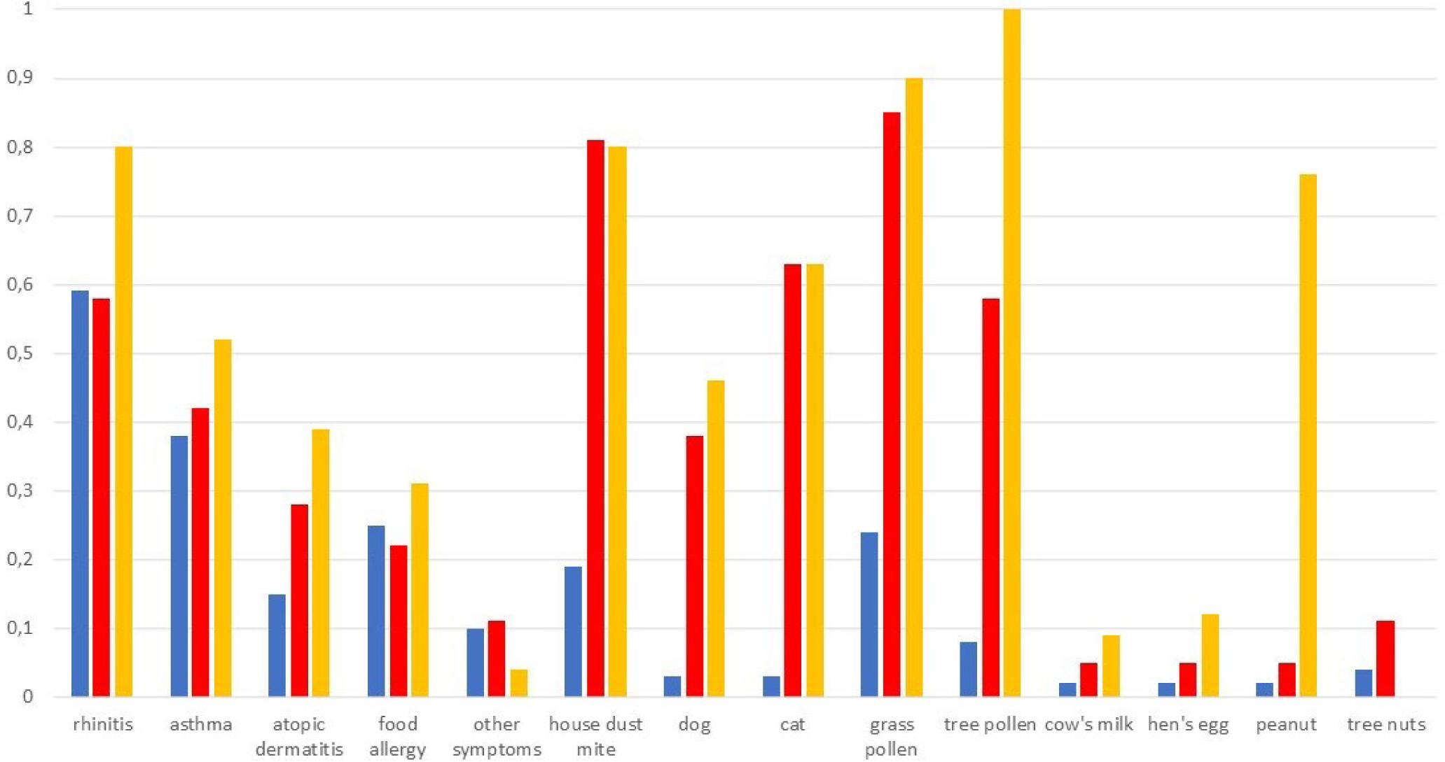 Figure 1 Distribution of symptoms and whole allergen sensitisation across the three classes distinguished by latent class analysis. Blue bars: class 1 (n = 135), red bars: class 2 (n = 74) and yellow bars: class 3 (n = 60).
