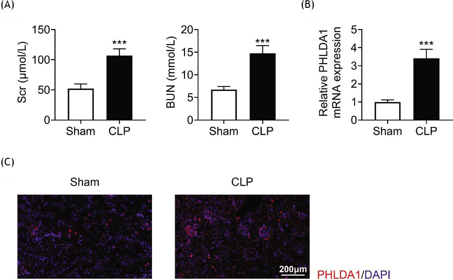 Figure 1 PHLDA1 is boosted in the renal tissues of AKI mice. Groups were separated as sham group (n = 6) and CLP group (n = 6). (A) The concentrations of BUN and SCr were evaluated via the corresponding commercial kits. (B) The level of PHLDA1 was revealed by RT-qPCR. (C) Immunofluorescence staining expressed the expression of PHLDA1. ***P ˂ 0.001 relative to sham group.