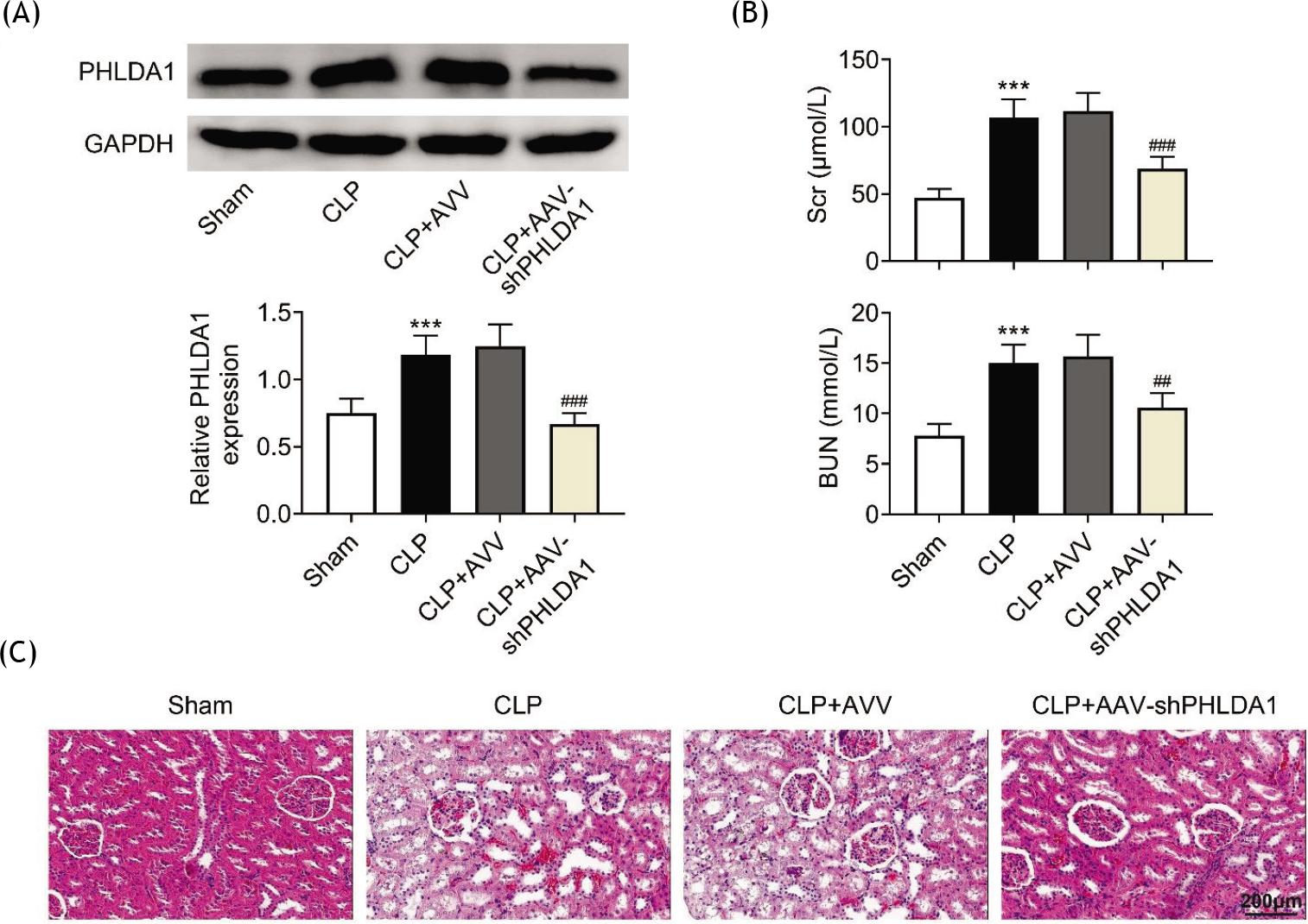 Figure 2 Silencing PHLDA1 alleviates renal injury. Groups were separated as sham group (n = 6), CLP group (n = 6), CLP+AAV group (n = 6), and CLP+AAV-shPHLDA1 group (n = 6). (A) The protein level of PHLDA1 was measured by Western blot analysis. (B) The concentrations of BUN and SCr were evaluated by corresponding commercial kits. (C) Hematoxylin and eosin staining uncovered the pathological changes of renal tissues. ***P ˂ 0.001 relative to sham group; ##P ˂ 0.01, ###P ˂ 0.001 relative to CLP+AAV group.