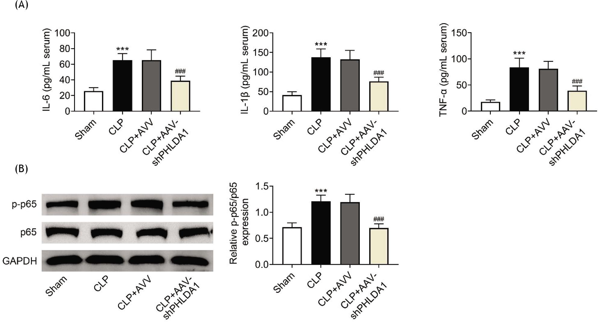 Figure 3 PHLDA1 knockdown reduces inflammation. Groups were separated as sham group (n = 6), CLP group (n = 6), CLP+AAV group (n = 6), and CLP+AAV-shPHLDA1 group (n = 6). (A) The concentrations of inflammation markers were detected by ELISA. (B) The protein levels of p-p65 and p65 were measured by Western blot analysis. ***P ˂ 0.001 relative to sham group; ###P ˂ 0.001 relative to CLP+AAV group.