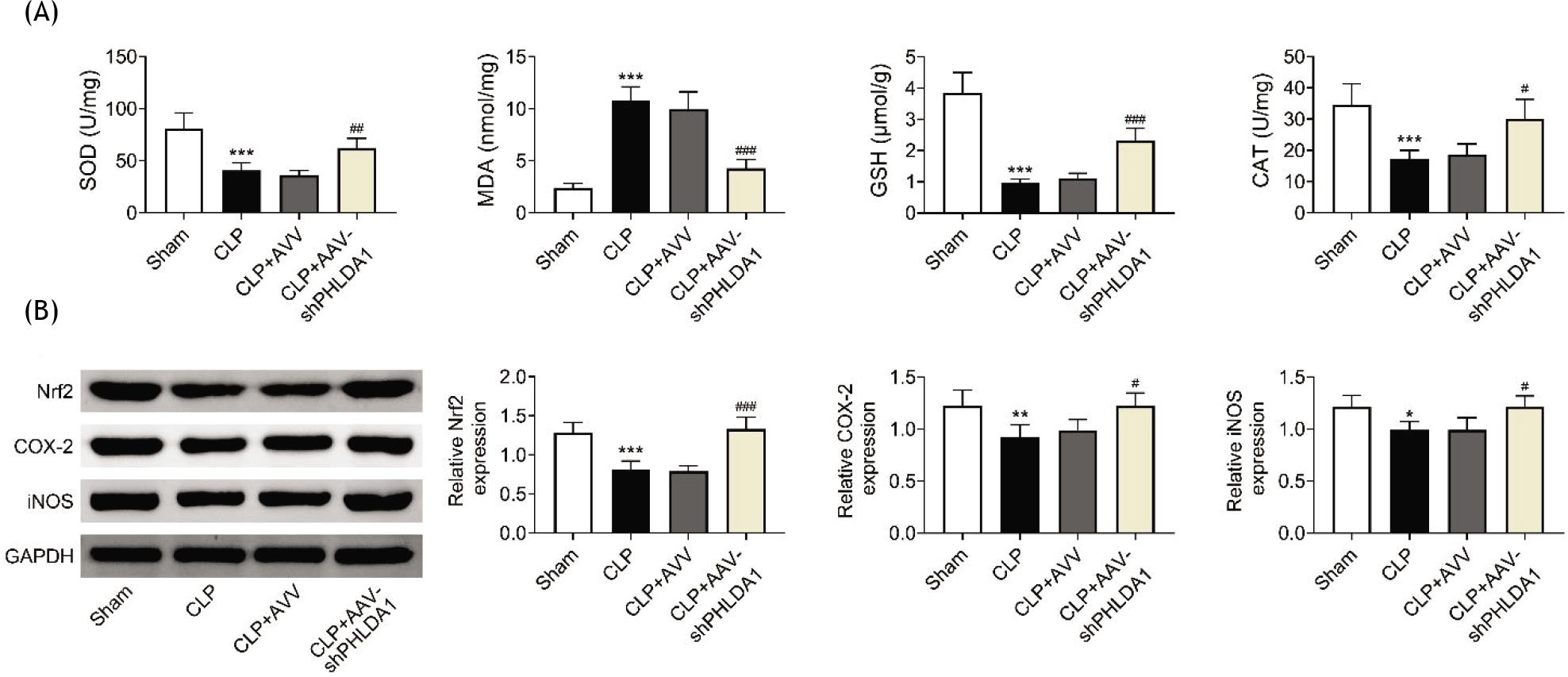 Figure 4 PHLDA1 alleviation ameliorates oxidative stress. Groups were separated AS sham group (n = 6), CLP group (n = 6), CLP+AAV group (n = 6), and CLP+AAV-shPHLDA1 group (n = 6). (A) The concentrations of SOD, MDA, GSH, and CAT were assessed through the corresponding commercial kits. (B) Western blot analysis tested the protein levels of Nrf2, COX-2, and iNOS. *P ˂ 0.05, **P ˂ 0.01 ***P ˂ 0.001 relative to sham group; #P ˂ 0.05, ##P ˂ 0.01, ###P ˂ 0.001 relative to CLP+AAV group.
