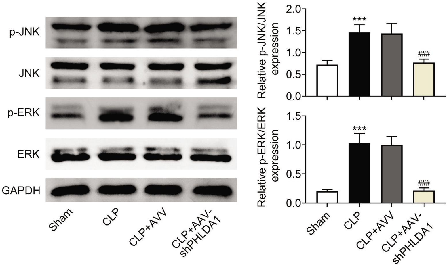 Figure 5 PHLDA1 knockdown suppresses JNK/ERK pathway activation. Groups were separated as sham group (n = 6), CLP group (n = 6), CLP+AAV group (n = 6), and CLP+AAV-shPHLDA1 group (n = 6). The protein levels of JNK, p-JNK, ERK, and p-ERK were examined through Western blot analysis. ***P ˂ 0.001 relative to sham group; ###P ˂ 0.001 relative to CLP+AAV group.