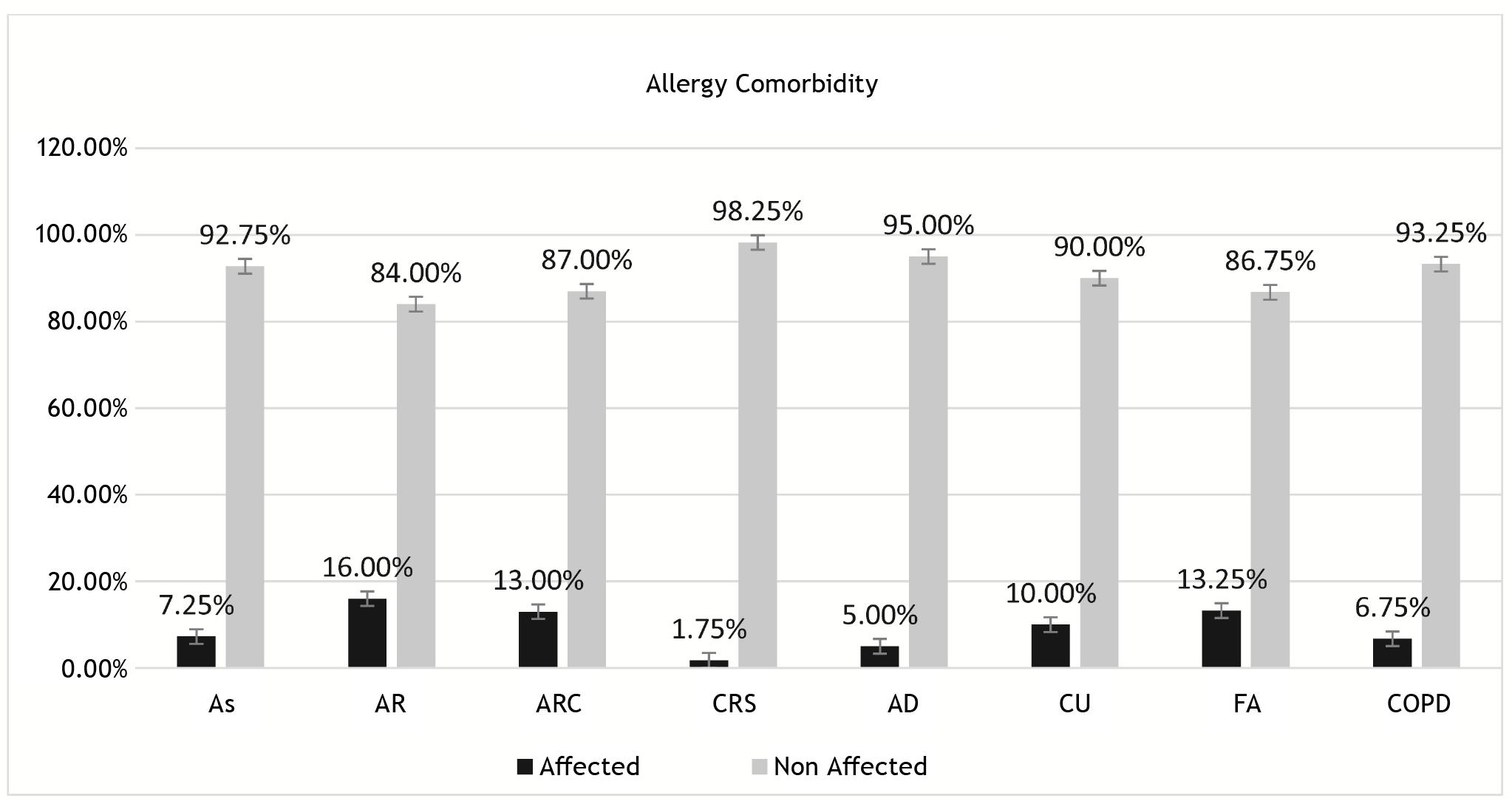 Results: Out of 400 COVID-19 patients admitted in the hospital, 158 (39.5%) presented with different allergic diseases, and a reverse association was observed between having allergic comorbidity and severity of COVID-19 infection (P = 0.005, relative risk = 0.96; 95% Confidence Interval (95% CI): 0.77–1.19). The respective frequency of asthma, allergic rhinitis (AR), chronic rhinosinusitis (CRS), atopic dermatitis, chronic urticaria, and food or drug allergy was 7.3%, 16%, 1.8%, 5%, 10% and 13.3%. Significantly, only AR was reversely associated with the severity of COVID-19 (P = 0.02, relative risk = 0.45; 95% CI: 0.77–1.19). Additionally, 43% of the patients presented hypoxemia, and 93.5% had chest CT scan involvement. Interestingly, patients with allergic diseases had significantly lower hypoxemia and chest CT involvement as compared with non-allergic patients (P = 0.002 and 0.003, respectively).