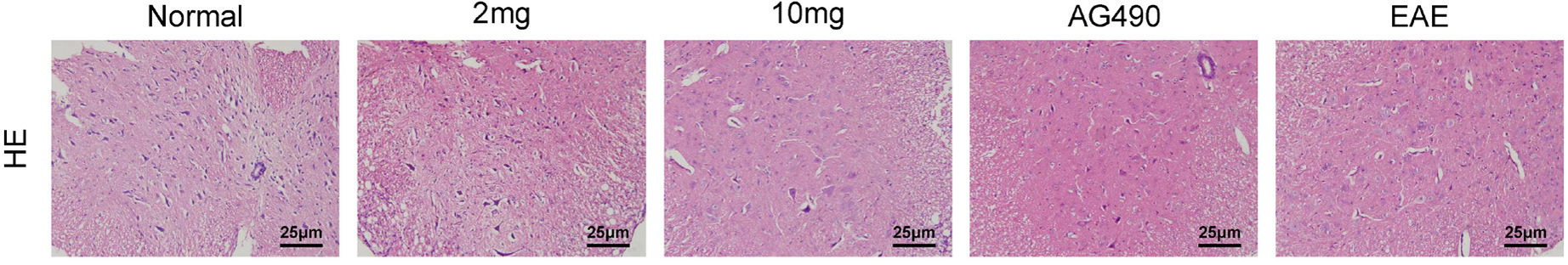 The pathological changes of the spinal cord in the 5 groups were observed 21 days after immunization. HE staining showed no evident inflammation in the control group. A significant number of inflammatory cells were observed in specimens from the EAE group. In addition, the number of inflammatory cells in the specimen was reduced after treatment with simvastatin (2 and 10 mg/kg) and AG490. Mice in the EAE group showed increased demyelinating foci compared to the control group. The demyelinating lesions in the simvastatin- and AG490-treated groups were less than in the EAE group (Figure 2).