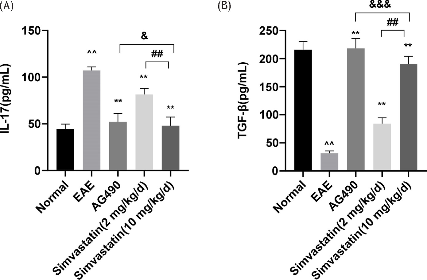 Figure 5 Effects of simvastatin on levels of interleukin (IL)-17 and TGF-β in EAE mice spleen. (A,B)The levels of IL-17 and TGF-β in the spleen were determined by enzyme-linked immunosorbent assay (ELISA). The data are expressed as mean ± standard deviation (n=5 in each group). **P<0.01, EAE vs. AG490 or Simvastatin (2 mg/kg) or Simvastatin (10 mg/kg), *P<0.05, EAE vs. AG490 or Simvastatin (2 mg/kg) or Simvastatin (10 mg/kg); ^^P<0.01, EAE vs. normal, ^P<0.05, EAE vs. normal. ##P<0.01, Simvastatin (10 mg/kg) vs. Simvastatin (2 mg/kg), #P<0.05. Simvastatin (10 mg/kg) vs. Simvastatin (2 mg/kg). & no significant difference, Simvastatin (10 mg/kg) vs. AG490, &&P<0.05, Simvastatin (10 mg/kg)vs. AG490, &&&P<0.01,Simvastatin (10 mg/kg) vs. AG490.