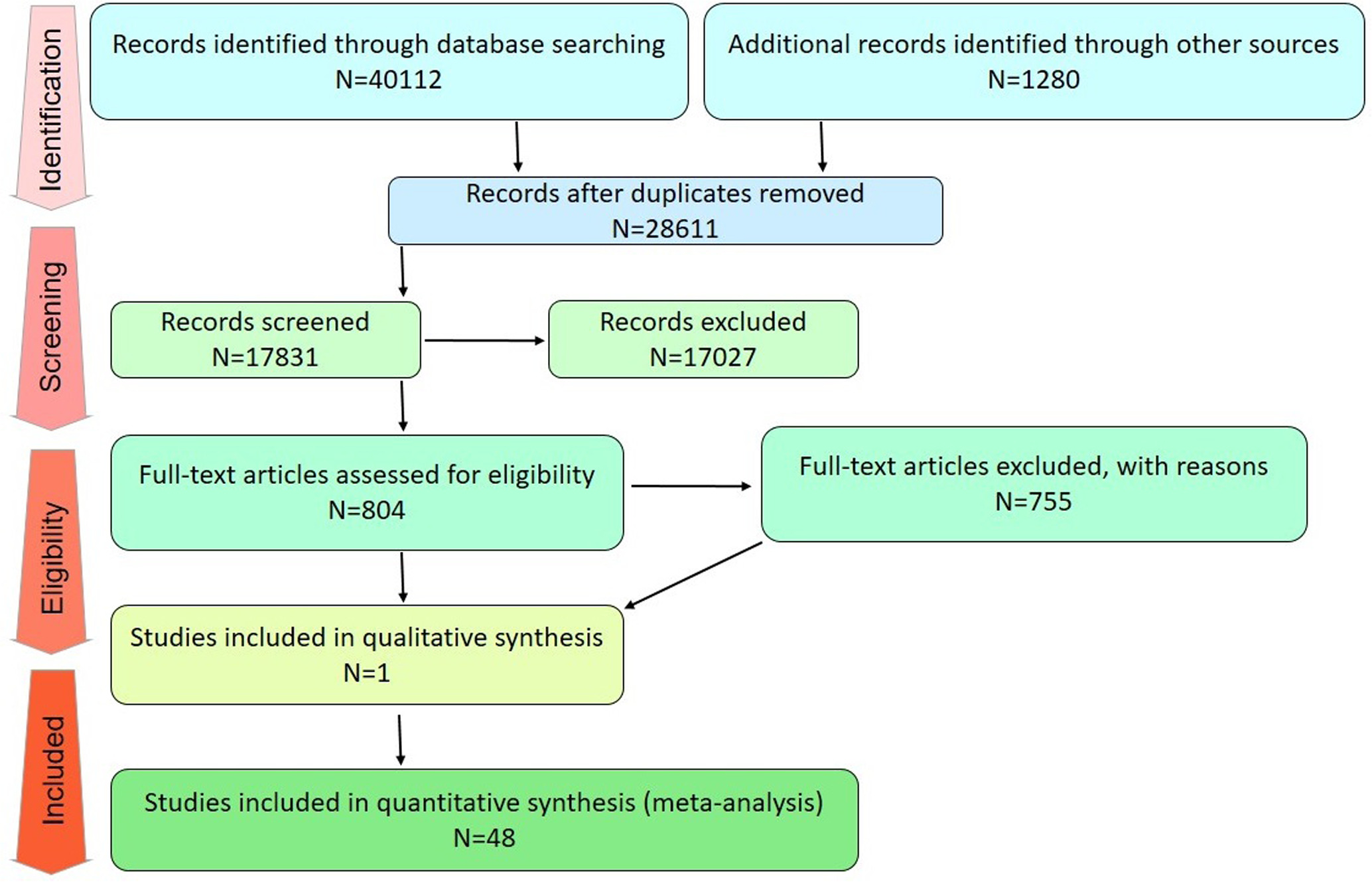 The searches resulted in 41,392 citations. After removing of duplications, 17,831 abstracts and titles were screened, and 17,027 publications were excluded. From the remaining 804 manuscripts, 756 were excluded after reviewing the full text and a total of 48 studies were included in the review (Figure 1). Studies involving overlapping patient populations were excluded from the analysis if they reported identical outcomes.