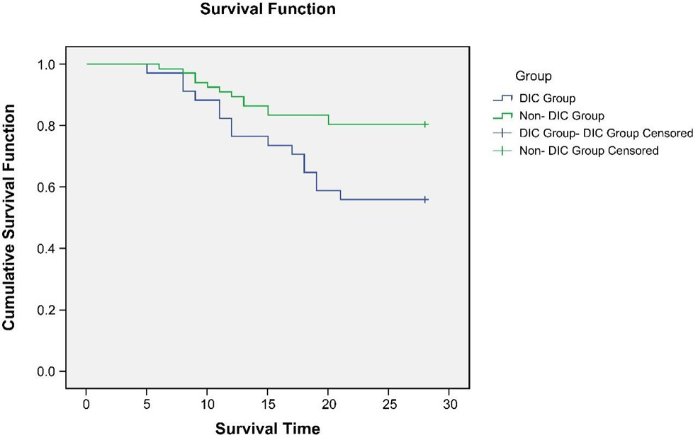 The 28-day survival of patients in the two groups was recorded, and survival curves were plotted to analyze and compare the outcomes between the DIC and non-DIC groups.