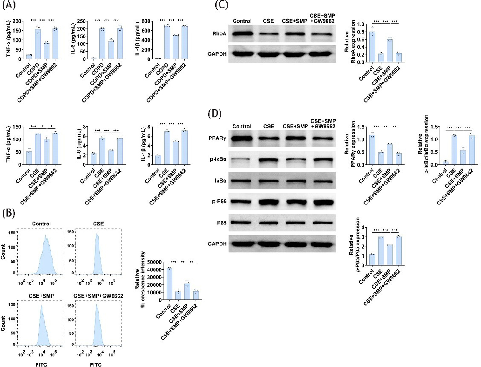 The experiment was divided into four groups (n=3): control group; CSE group; CSE +200 µg/mL SMP group; COPD + 200 µg/mL SMP + 200 µg/mL GW9662 group.