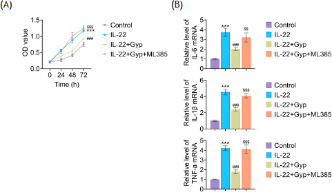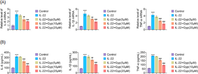 Figure 2 Gyp attenuated inflammation in IL-22-indued HaCaT cells. (A) The relative mRNA expression level of IL-1β, IL-6 and TNF-α was detected by RT-qPCR. Data were expressed after being normalized with GAPDH. (B) The concentration of IL-1β, IL-6 and TNF-α in the cellular supernatant was measured by ELISA. ***P < 0.001 vs. control; ##P < 0.01 and ###P < 0.001 vs. IL-22.