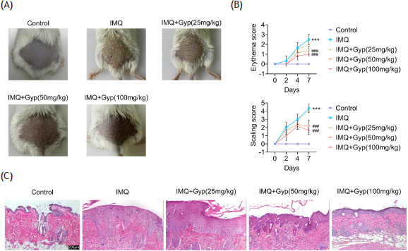 Figure 3 Gyp improved IMQ-induced psoriasis skin damage in mice. 62.5 mg IMQ was topically applied on the mice to induce an in vivo model of psoriasis, and received intragastric administration of 100-mg/kg Gyp once a day for 4 weeks. (A) The macroscopic appearance of back skin of mice on day 8. (B) On days 0, 2, 4 and 7, erythema and scaling were evaluated using the PASI. (C) The histopathological assessment by H&E staining. Scale bar = 200 µm. ***P < 0.001 vs. control; ###P < 0.001 vs. IMQ.