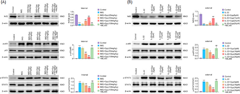 Figure 5 Gyp reduced the expression of NF-κB and STAT3 by activating Nrf2 in psoriasis. Mice were topically applied with 62.5-mg IMQ to induce an in vivo model of psoriasis, and received intragastric administration of 100-mg/kg Gyp and intraperitoneal injections of 30-mg/kg ML385 once a day for 4 weeks. (A) The relative protein expression of Nrf2, p-p65, p65, p-STAT3 and STAT3 was examined by Western Blot analysis in skin tissues of mice. Data were expressed after being normalized with β-actin. ***P < 0.001 vs. control; ###P < 0.001 vs. IMQ; $$$P < 0.001 vs. IMQ+Gyp (100 mg/kg). (B) The relative protein expression of Nrf2, p-p65, p65, p-STAT3 and STAT3 was examined by Western Blot analysis in HaCaT cells. Data were expressed after being normalized with β-actin. ***P < 0.001 vs. control; #P < 0.05 and ###P < 0.001 vs. IL-22; $$$P < 0.001 vs. IL-22+Gyp (20 µM).