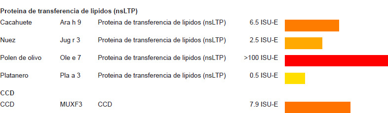 Specific immunoglobulin E (IgE) levels and molecular study were measured, and positive results were obtained for pollens, house dust mites, and horse, cat, and dog epithelium. The patient also tested positive for some lipid transporter proteins (LTPs) and cross-reactive carbohydrate determinants (CCDs) (Figure 1).