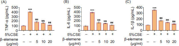 Figure 3 β-elemene attenuated cigarette smoke-induced inflammation. Groups were separated as follows: control, 5% CSE, 5% CSE+β-elemene (5 μg/mL), 5% CSE+β-elemene (10 μg/mL), and 5% CSE+β-elemene (20 μg/mL) groups. (A–C) The levels of TNF-α, IL-6, and IL-1β were inspected through ELISA. ***P < 0.001 versus the control group; $$$P < 0.001 versus the 5% CSE group.