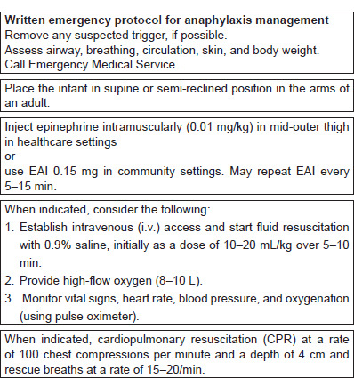 4 Greenhawt M, Gupta RS, Meadows JA, Pistiner M, Spergel JM, Camargo CA Jr, et al. Guiding principles for the recognition, diagnosis, and management of infants with anaphylaxis: An expert panel consensus. J Allergy Clin Immunol Pract. 2019 Apr;7(4):1148–56.e5. 10.1016/j.jaip.2018.10.052. Epub 2019 Feb 5.