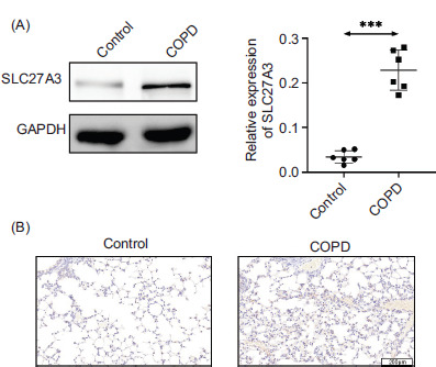 Figure 1 SLC27A3 expression is elevated in COPD models. (A) Protein expression of SLC27A3 in lung tissue. (B) Immunohistochemical staining of SLC27A3 in lung tissue. Values are presented as mean ± SD. ***p < 0.001 versus control group. n=6.