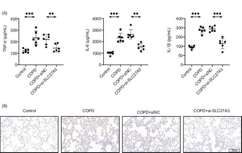 Figure 3 Knockdown of SLC27A3 inhibits inflammation in COPD mice. (A) ELISA to detect the levels of inflammatory factors (IL-6, IL-1β, TNF-α) in serum. (B) Immunohistochemical determination of TNF-α expression in lung tissue. Values are presented as mean ± SD. **p < 0.01, ***p < 0.001. n=6.