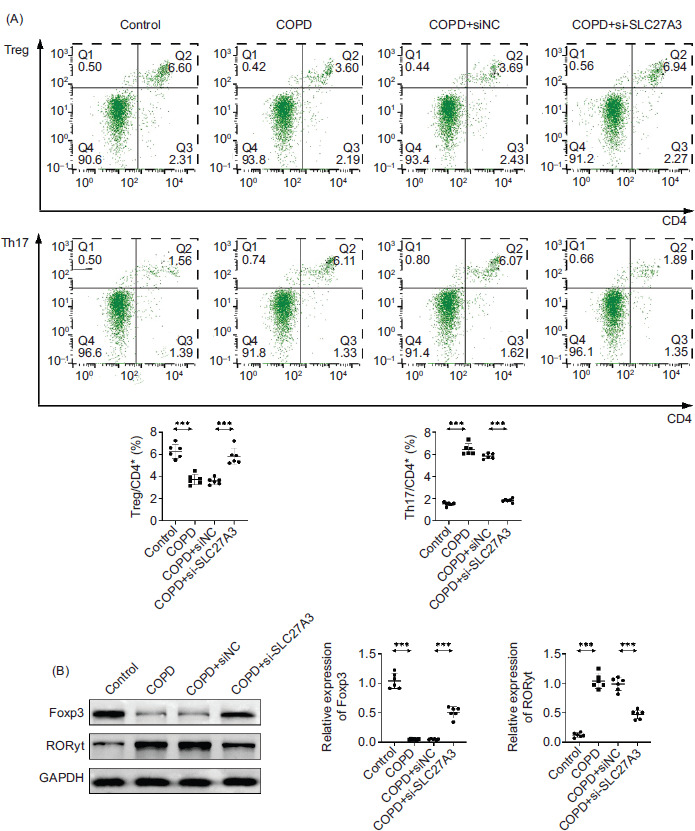 Figure 4 Knockdown of SLC27A3 restores Th17/Treg balance in COPD mice. (A) Flow cytometry was used to detect the proportion of Treg and Th17 cells. (B) Western blotting to detect Foxp3 and RORγt protein expression. Values are presented as mean ± SD. ***p < 0.001. n=6.