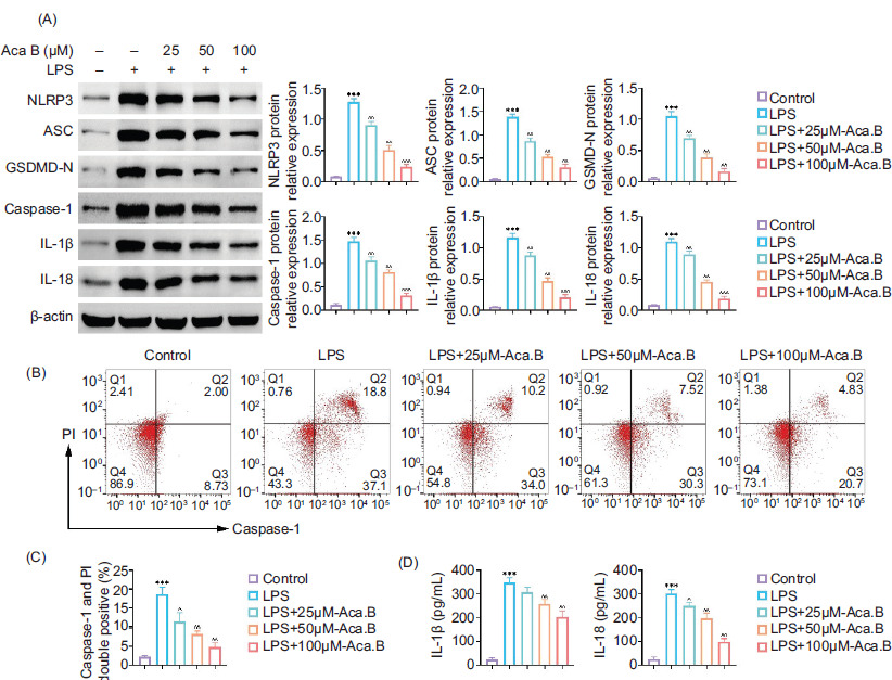 Figure 2 Aca.B ameliorates NLRP3-mediated proptosis in MODE-K cells. (A) Expressions of NLRP3, ASC, GSDMD-N, Caspase-1, IL-1β, and IL-18 were determined in MODE-K cells treated with LPS or Aca.B using immunoblotting. The grayscale value of the corresponding band was quantitated with ImageJ. (B) Caspase-1 activity in MODE-K cells treated with LPS or Aca.B was assessed using flow cytometry (FCM) analysis. (C) Quantitative statistics of double positive for caspase-1 and Propidium iodide (PI) staining. (D) Secretion of IL-1β and IL-18 was evaluated in MODE-K cells treated with LPS or Aca.B using ELISA. ***P < 0.001, compared with the control group. ^P < 0.05, ^^P < 0.01, and ^^^P < 0.001, compared with the LPS group. Aca.B: Acanthoside B.