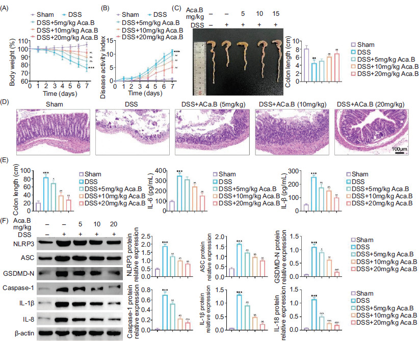 Figure 3 Aca.B alleviates dextran sulfate sodium (DSS)-induced ulcerative colitis and NLRP3-mediated proptosis in mice. The C57BL/6 mice were subjected to the DSS-induced ulcerative colitis. Aca.B in various concentrations was orally administrated twice a day for consecutive 7 days. (A) Change in body weight, (B) disease activity index (DAI), and (C) colon length were measured. (D) Pathological changes in colons were evaluated using H&E staining. (E) Inflammatory factor levels (TNF-α, IL-6, and IL-1β) in serum were assessed using ELISA. (F) Expressions of NLRP3, ASC, GSDMD-N, Caspase-1, IL-1β, and IL-18 were determined in tissue samples using immunoblotting analysis. The grayscale value of the corresponding band was quantitated with ImageJ. **P < 0.01 and ***P < 0.001, compared with the Sham group. ^P < 0.05, ^^P < 0.01, and ^^^P < 0.001, compared with the DSS group. Aca.B: Acanthoside B.