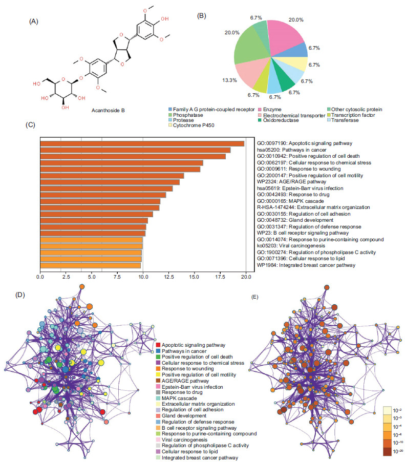 Figure 4 The Aca.B target pathways prediction. (A) The chemical structure of Aca.B. (B) The predicted binding targets of Aca.B using Swiss Target Prediction website. (C) The predicted downstream signaling pathways of Aca.B using Swiss Target Prediction website. (D and E) Network analysis of the predicted downstream signaling pathways. The node color reflects P value. Aca.B: Acanthoside B.